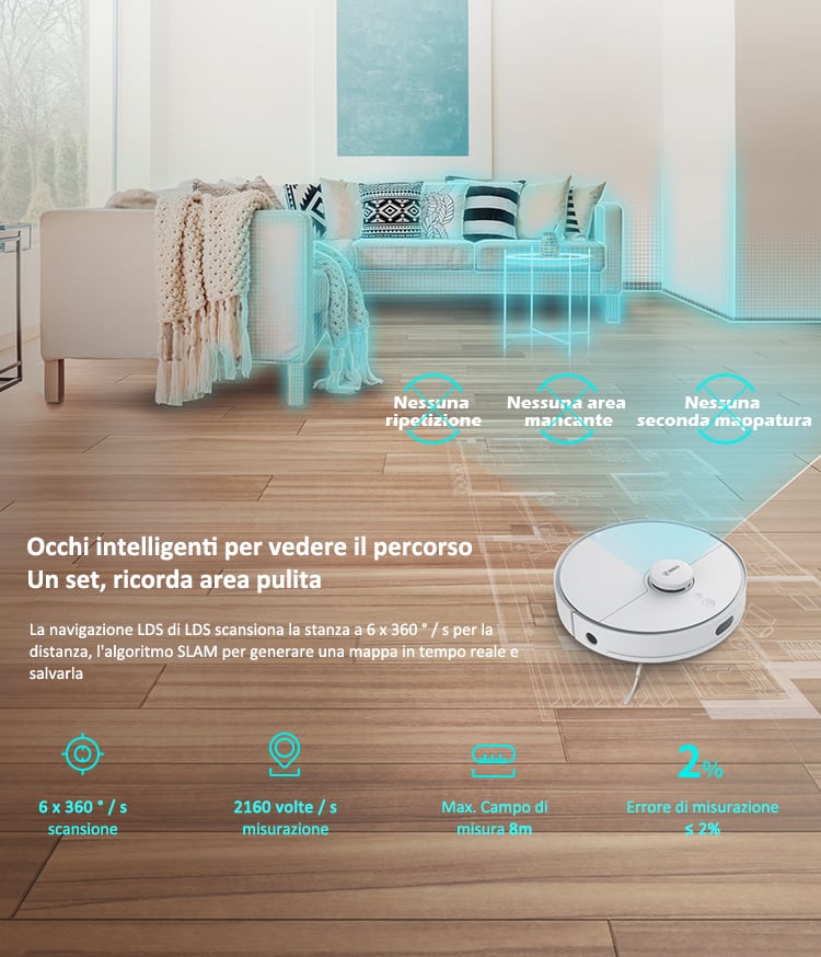 Il complesso set di Sensori Laser (LSD + SLAM) di cui è dotato questo prodotto, lo rende impeccabile nello svolgimento del suo lavoro. Il tracciamento attivo infatti realizza una sorta di mappa digitale che viene rielaborata in tempo reale dal processore del nostro aspirapolvere in modo da essere sempre più precisa. Questo si traduce in ottimizzazione degli spostamenti, dei costi energetici e della pulizia della nostra casa.