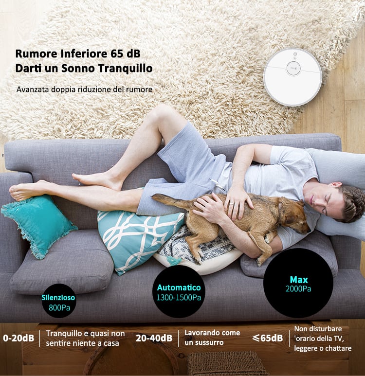 Il potente motore da ben 2000Pa è capace di aspirare qualsiasi cosa da qualsiasi superficie pur rimanendo molto efficiente ed ottimizzando la potenza di aspirazione a seconda della superficie che si ritroverá ad attraversare.