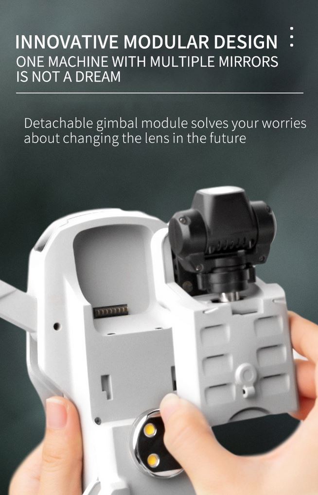 Particolare e originale anche il DESIGN MODULARE, sarà possibile ad esempio rimuovere il modulo CAM + GIMBAL per sostituirlo in futuro, sulla parte superiore è presente un SLOT DI ESPANSIONE dove collegare, ad esempio, un MEGAFONO, una WATER GUN, un AIRDROPPER e molto altro.