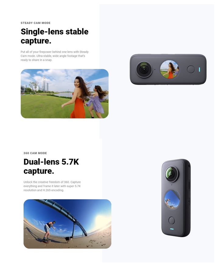 DUE FOTOCAMERE IN UN SOLO CORPO, questo è il segreto che permette alla INSTA360 di riprende video “sferici” da cui ricavare facilmente e senza troppo sforzo, tramite la post produzione permessa dall’APP dedicata, risultati strabilianti e… unici.