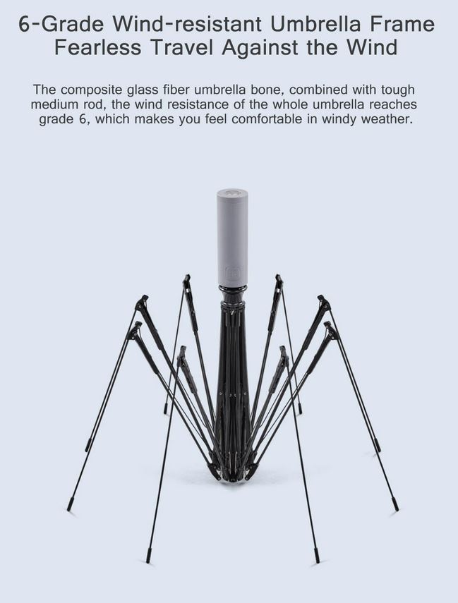 Il 90FUN 8K è di fatto il primo OMBRELLO SMART della casa cinese, ma come può esserlo? Prima di arrivare a parlarvene è doveroso spendere due righe per quanto riguarda la sua eccellente qualità costruttiva, a differenza dei tradizionali ombrelli infatti, questo modello è progettato con la struttura principale rovesciata, che unita ai “bracci” in fibra di vetro garantiscono una RESISTENZA AL VENTO DI LIVELLO 6, tra le più alte nel settore.