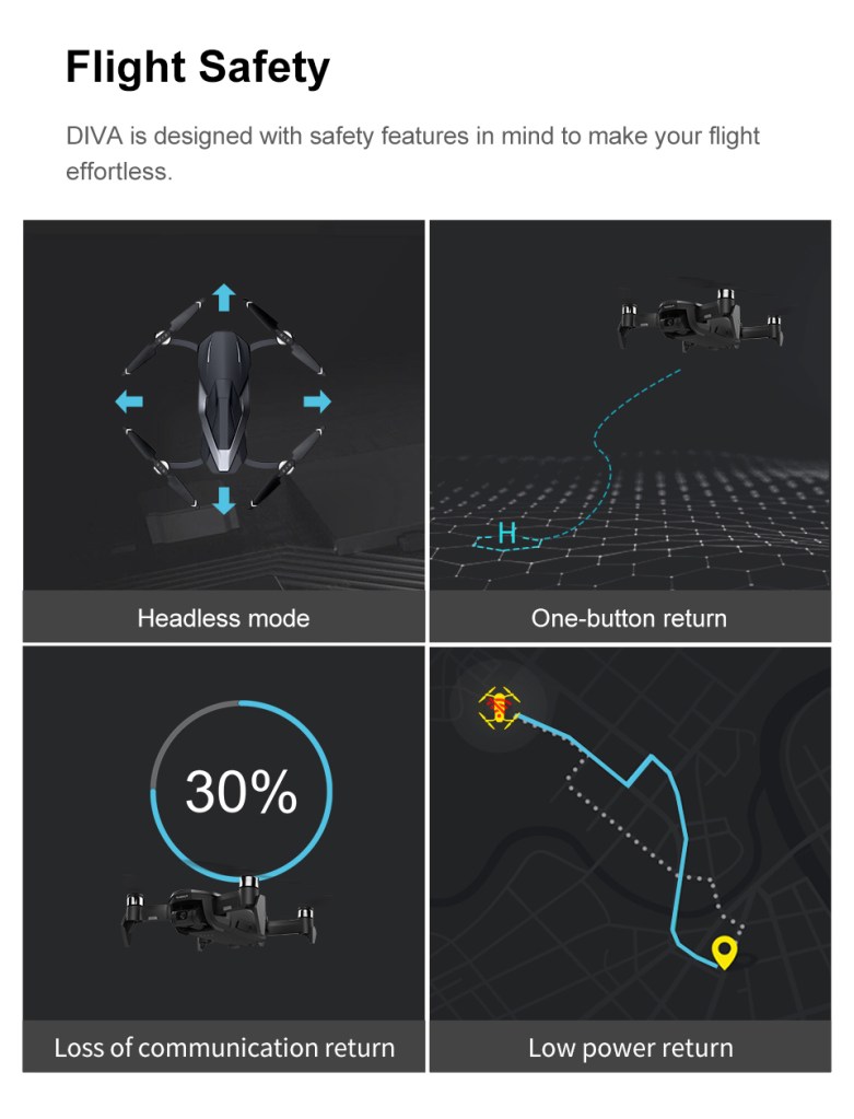 Il FUNSNAP DIVA è un Drone Pieghevole dalle sembianze vagamente simili al DJI MAVIC AIR primo modello, dotato di MOTORI BRUSHLESS, GPS e VPU, il tutto racchiuso in circa 430 GRAMMI, che richiederanno quindi il conseguimento del PATENTINO ONLINE per potere essere utilizzato legalmente nel nostro paese.