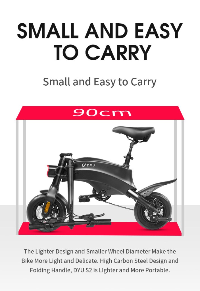DYU è sempre stato un brand innovatore nel campo della mobilità elettrica, proponendo bici compatte ma estremamente tecnologiche e la DYU S2 non fa eccezione. Si tratta di una piccola BICI ELETTRICA, super compatta, ALTA 90CM e dal PESO DI APPENA 15KG, esattamente come un Monopattino Elettrico di buona qualità, questo ci permette di trasportala comodamente anche sui mezzi pubblici e magari caricarla in auto senza tropppe difficoltà.
