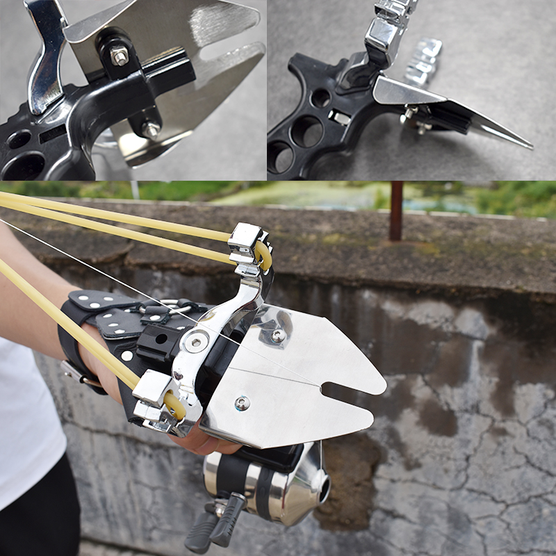 Il nome non inganna, si tratta di una vera e propria FIONDA DA PESCA componibile con vari accessori. Ancorata al nostro polso per evitare di perderla al primo pesce abboccato, sulla comoda impugnatura troviamo una grossa piastra con tanto di FIONDA ad elastici; prepariamo il nostro dardo, collegato al filo del mulinello (posto nella parte più bassa dell’accrocchio) e lanciamo!