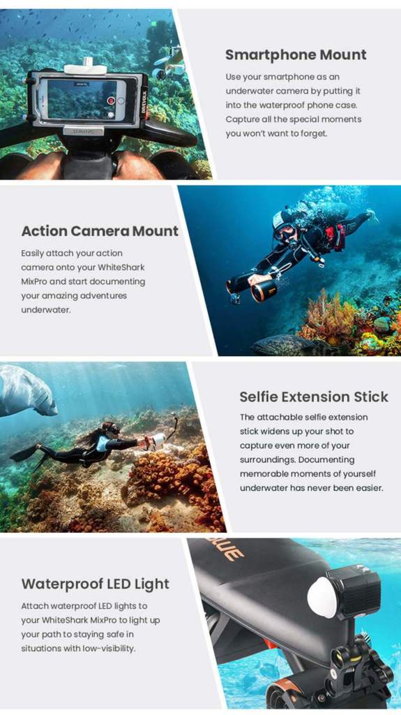 Una chicca mica da poco è rappresentata dalla MOUNT IMPERMEABILE PER SMARTPHONE E ACTION CAM, potrete installare in un attimo il vostro dispositivo per effettuare RIPRESE SUBACQUEE che lasceranno i vostri amici senza fiato, presente anche la predisposizione per utilizzare eventuali TORCE LED!