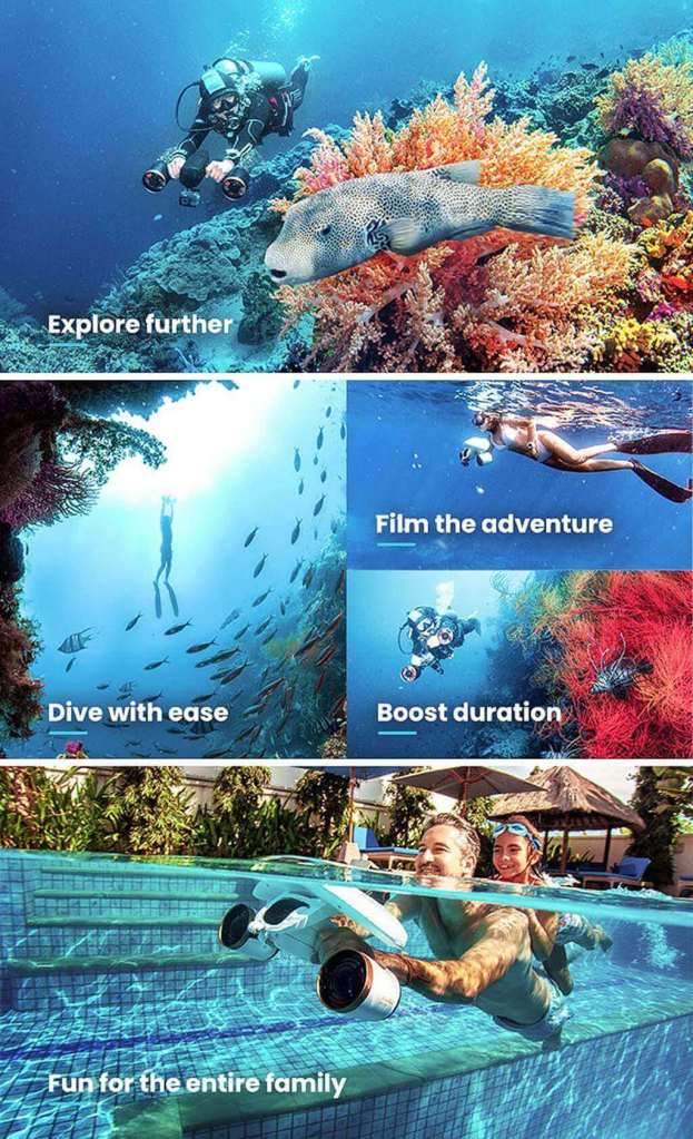La BATTERIA REMOVIBILE e ricaricabile permette fino a 60 MINUTI DI AUTONOMIA… in acqua. Grande attenzione è stata posta sul versante SICUREZZA, le turbine ad elica di questi mezzi sono spesso molto esposte e pericolose per le nostre mani (e capelli), ma in questo caso sono state molto rimpicciolite ed inglobate in una gabbia protettiva, può essere quindi utilizzato in totale sicurezza.