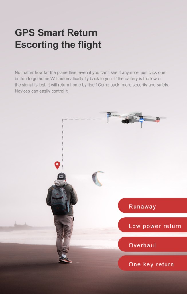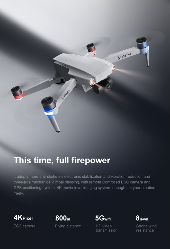 L’L106 PRO permette svariate QUICK SHOT tra cui RETURN TO HOME, SMART FOLLOW, WAYPOINT FLIGHT e ORBIT MODE, questo grazie al GPS GLONASS + VPU (utilizzabile anche per scattare foto) montati a bordo. La trasmissione video passa dal WI-FI 5GHZ e garantisce, in accoppiata al RADIOCOMANDO in dotazione, fino a 800 METRI di controllo radio.