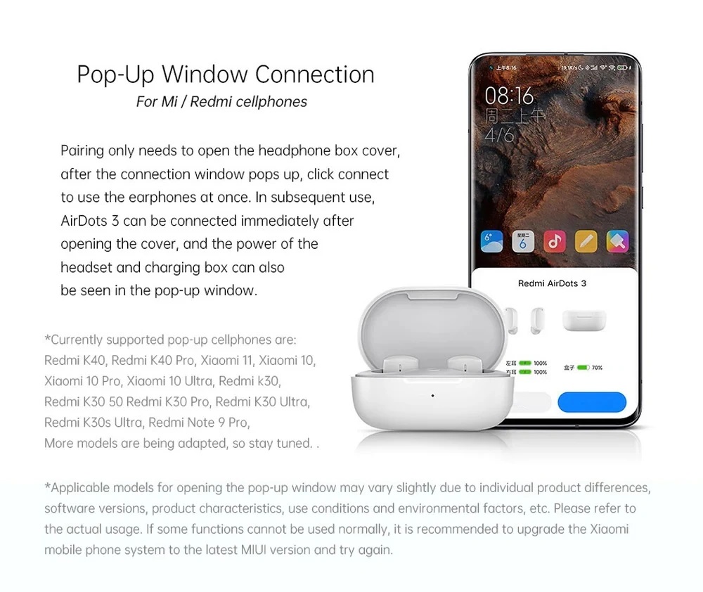 Nuovi anche i CONTROLLI TOUCH che ora non richiedono più nessuna pressione ma solo un semplice sfioramento. In modo analogo agli auricolari di APPLE, anche le AirDots 3 mostrano un POP-UP di carica sul nostro smartphone compatibile (per ora solo XIAOMI). Permane il MICROFONO (migliorato) e la CERTIFICAZIONE IPX4 WATERPROOF, risultando perfette anche per l’uso durante un allenamento sportivo.