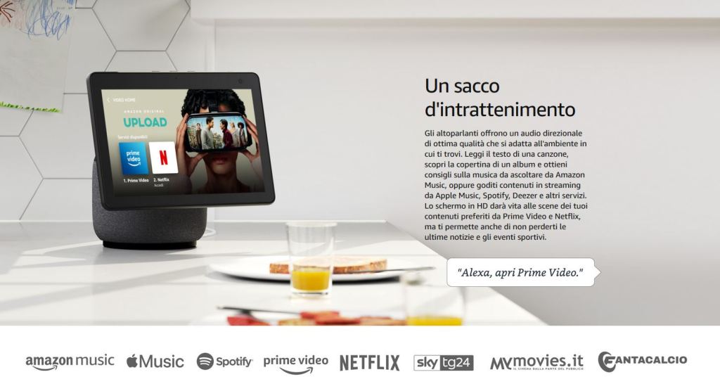 Il NUOVO ECHO SHOW 10 (3ª generazione) presenta un generoso DISPLAY DA 10.1 POLLICI con CAM FRONTALE DA 13MP per le Videochiamate (oscurabile tramite lo switch meccanico) ed un SISTEMA AUDIO composto da 2 TWEETER DA 1″ (25mm) e 1 WOOFER DA 3″ (76mm) per la migliore qualità sonora. Pensate, è possibile persino riprodurre FILM e SERIE TV da NETFLIX e AMAZON PRIME VIDEO!