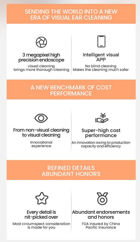 Potremo SCATTARE FOTO, REGISTRARE VIDEO e rimuovere con cura il cerume tramite le “palette” alla sua estremità, ovviamente lavabili e sostituibili in qualsiasi momento, come potete vedere dalle immagini qui sotto.