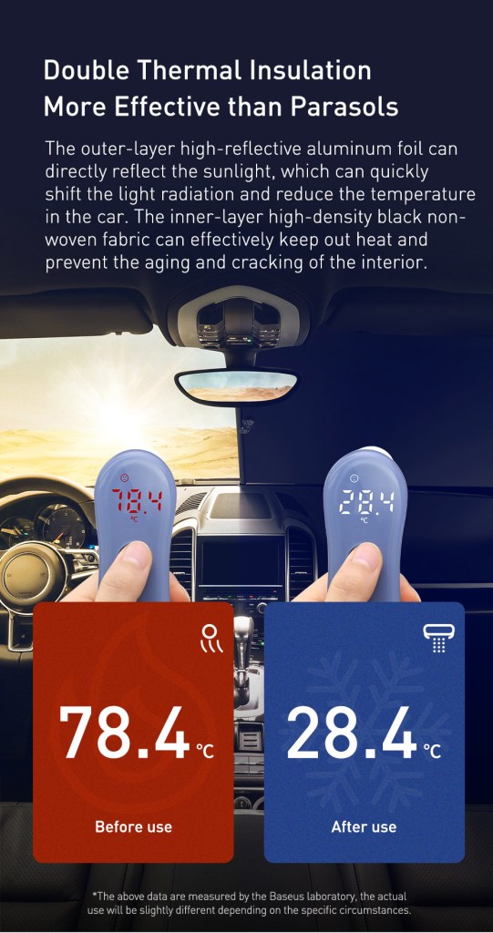 Il BASEUS CAR WINDSHIELD SUNSHADE è disponibile in DUE DIVERSE MISURE in base alla tipologia del nostro veicolo e, secondo i test del marchio, le temperature si dimezzano con il suo utilizzo.
