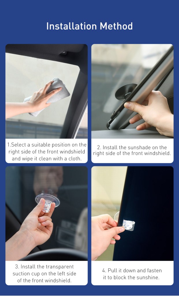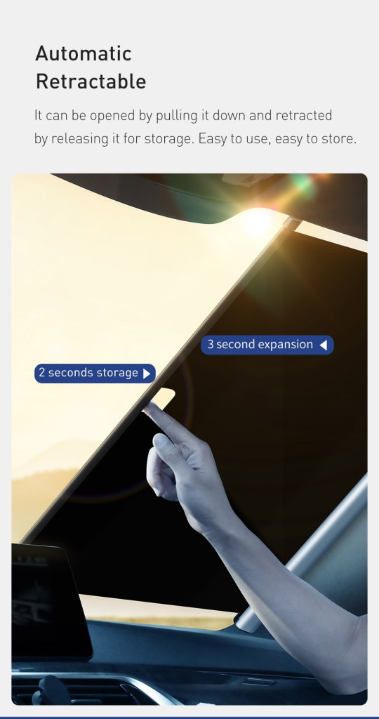 Il problema di questi prodotti è la loro scarsa praticità, non sappiamo mai dove riporli ed occupano spazio, ed è qui che entra in gioco il BASEUS CAR WINDSHIELD SUNSHADE, occupa pochissimo spazio e può essere lasciato incollato con le sue ventose ad un lato del parabrezza senza ostacolare la visuale, in quanto all’interno della bella staffa in alluminio è racchiuso il tessuto che si srotola automaticamente… come fosse un rotolo di carta, e garantisce doppio isolamento termico.
