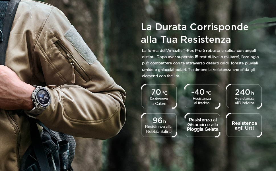 Amazfit lo definisce un RUGGED WATCH, ovvero uno Smartwatch in grado di resistere più di altri dispositivi ad urti, intemperie ed altri “inconvenienti naturali”, per dimostrarlo ci sono le tante certificazioni ottenute, come il GRADO DI IMPERMEABILITÀ 10 ATM (fino ai 100 METRI di profondità), la ROBUSTEZZA DI LIVELLO MILITARE e la RESISTENZA TERMICA da -40°c a +70°c.