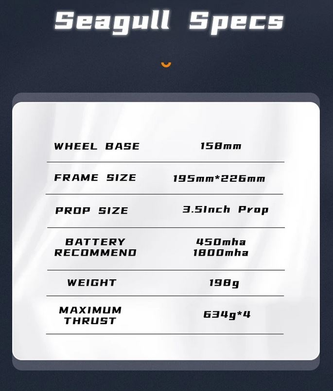 SEAGULL è acquistabile unicamente in un KIT BUNDLE RTF, ovvero READY TO FLY (PRONTO AL VOLO), questo significa che non dovremo perdere giornate intere cercando di configurarlo, ma potremo subito volarci appena tirato fuori dalla confezione e inserita la batteria.