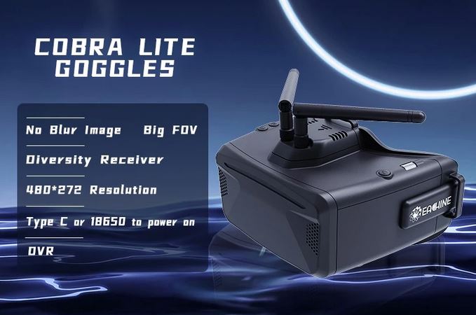 Gli OCCHIALI FPV sono i COBRA LITE GOGGLES di EACHINE / SKYZONE, una delle soluzioni più apprezzate dai principianti, comodi da indossare, il DISPLAY ha una risoluzione adeguata (480*272), DIVERSITY, DVR e possibilità di installare un modulo ricevente esterno per migliorare la ricezione.