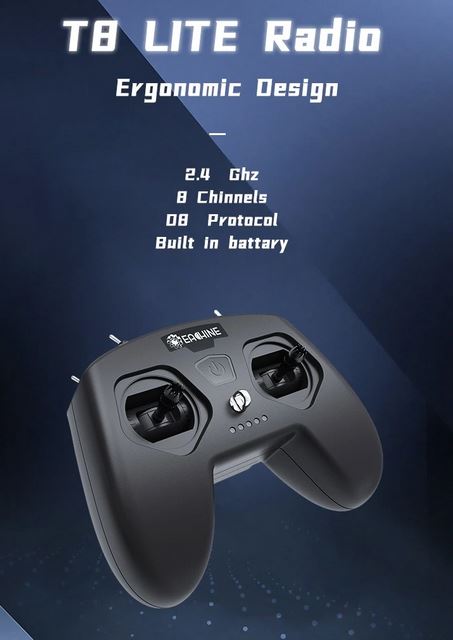 Anche la RADIO è prodotta da EACHINE, si tratta del modello T8 LITE, molto ergonomico e dal design simile al controller della playstation, funziona a 2.4GHZ, D8 PROTOCOL, BATTERIA INTEGRATA RICARICABILE e tutti i comandi che servono per iniziare a volare senza fare confusione.