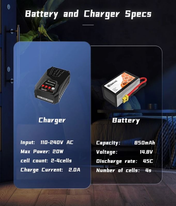 Il KIT comprende infine una BATTERIA 850MAH 14.8V 45C 4S ed un CARICABATTERIE 20W 2-4 CELLE.