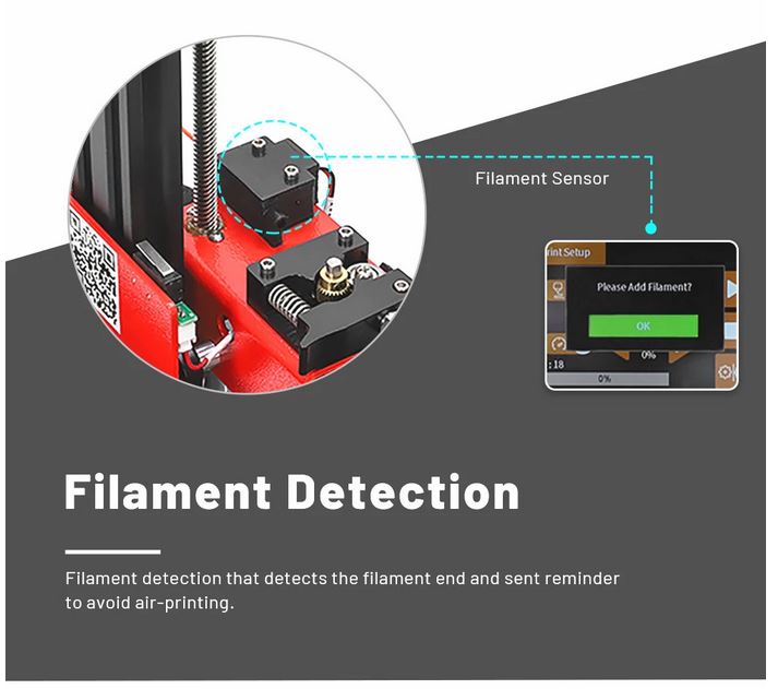 Tra le sue caratteristiche principali troviamo un PIATTO DI STAMPA 220*220*255mm adatto per qualsiasi stampa di un principiante, è inoltre AUTOLIVELLANTE, permettendoci di risparmiare molto tempo. Ci vengono in soccorso anche alcuni sensori molto utili, come la possibilità di riprendere la stampa dopo una interruzione elettrica e il rilevatore di filamento.