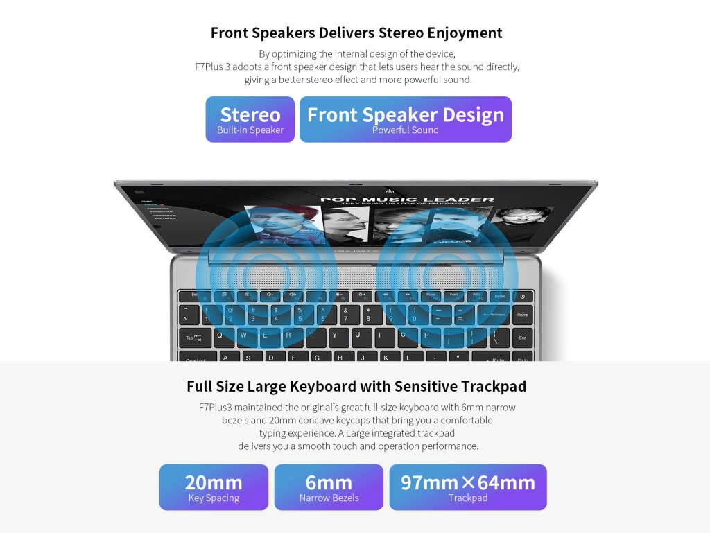 Come i modelli precedenti, anche l’F7 PLUS 3 condivide la struttura interamente in ALLUMINIO molto sottile dal peso complessivo di 1.3KG, su cui spicca l’ampia TASTIERA QWERTY ed il bel DISPLAY DA 14.1 POLLICI FULL HD con tecnologia IPS e cornici quasi assenti.