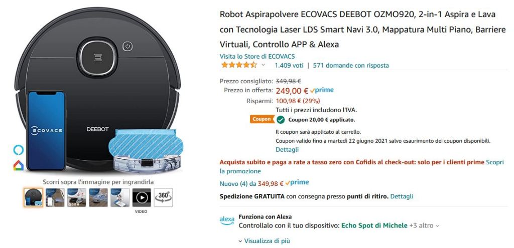 ECOVACS DEEBOT OZMO920 è uno dei ROBOT ASPIRAPOLVERE con funzione LAVAPAVIMENTI più acquistati su Amazon e al prezzo di appena 229 EURO invece di 349 EURO è davvero imperdibile, compatibile con ALEXA!