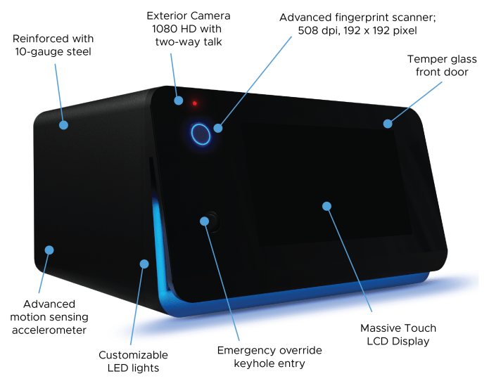 All’interno della cassetta troviamo un sistema di ILLUMINAZIONE LED, 2 PORTE USB DI RICARICA e persino una TELECAMERA FULL HD che mostrerà e registrerà in tempo reale il volto dell’eventuale “ladro”. Estremamente resistente a qualsiasi tentativo di scasso, il suo ACCELEROMETRO INTEGRATO azionerà automaticamente l’ALLARME al primo movimento sospetto.