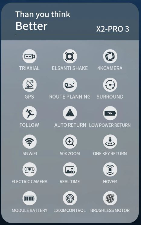 Iniziamo dalle sue caratteristiche tecniche, X2-PRO 3 è un DRONE PIEGHEVOLE con MOTORI BRUSHLESS che garantiscono elevata resistenza al vento e 25 MINUTI DI AUTONOMIA IN VOLO, il design riprende quello del ben più noto DJI MAVIC PRO, compresa la forma delle eliche.