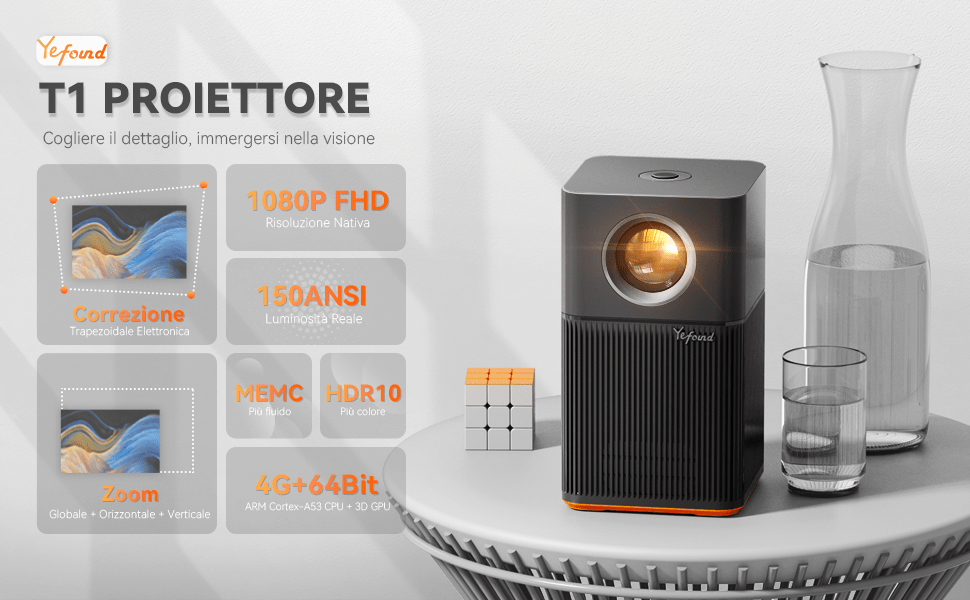 YEFOUND T1 è un PROIETTORE LED con RISOLUZIONE NATIVA FULL HD (1920*1080P) e pieno supporto al 4K, luminosità di 150 ANSI LUMENS (RAPPORTO CONTRASTO 2000:1) e dimensione massima dello “schermo” di ben 200 POLLICI attraverso lo ZOOM DIGITALE, con funzione di correzione trapezoidale elettronica che ne facilita e migliora l’esperienza d’uso.