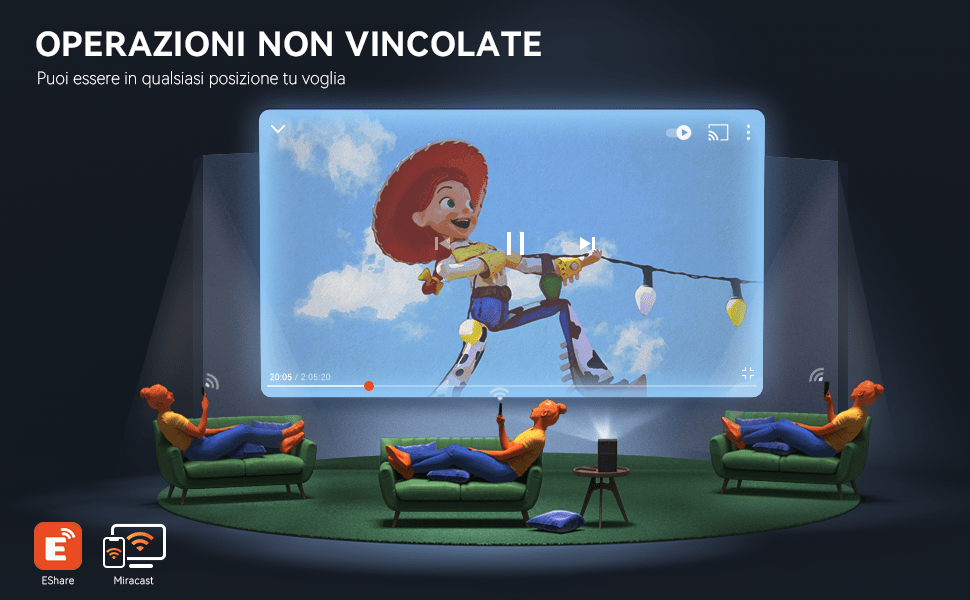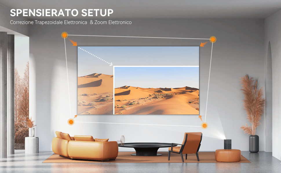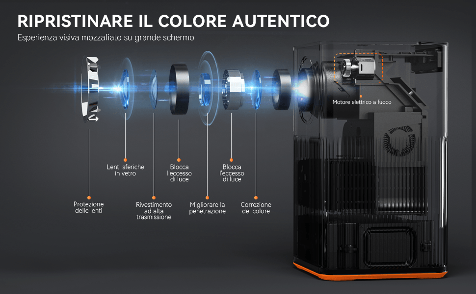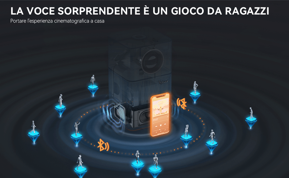 Occhio di riguardo anche per il COMPARTO AUDIO, incapsulato nel proiettore troviamo un ALTOPARLANTE DA 10 WATT combinato alla funzione di CANCELLAZIONE DEL RUMORE per il massimo dell’immersione, potrete comunque collegare uno SPEAKER ESTERNO sfruttando il BLUETOOTH.