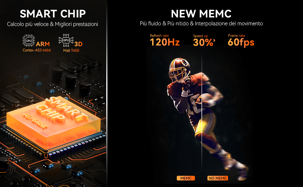 Grazie al veloce PROCESSORE ARM CORTEX-A53 64BIT coadiuvato dalla MALI T450 3D GPU il REFRESH RATE ARRIVA AI 120HZ con piena integrazione all’HDR10, queste parole si traducono in maggiore gamma dinamica e riduzione del rumore video.