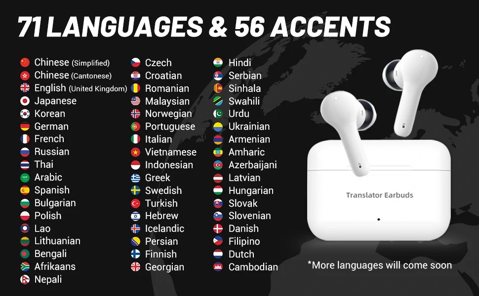 TIMEKETTLE M6 sono sì, degli AURICOLARI BLUETOOTH 5.0 con 24 ORE DI AUTONOMIA COMPLESSIVA e CANCELLAZIONE DEL RUMORE DI FONDO, adatti per riprodurre musica ed effettuare chiamate, ma a questo si aggiunge la sua peculiare caratteristica di TRADUTTORE VOCALE, sono infatti supportate ben 127 LINGUE (71 LINGUE + 56 ACCENTI) e ulteriori ne arriveranno con i prossimi aggiornamenti.