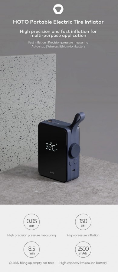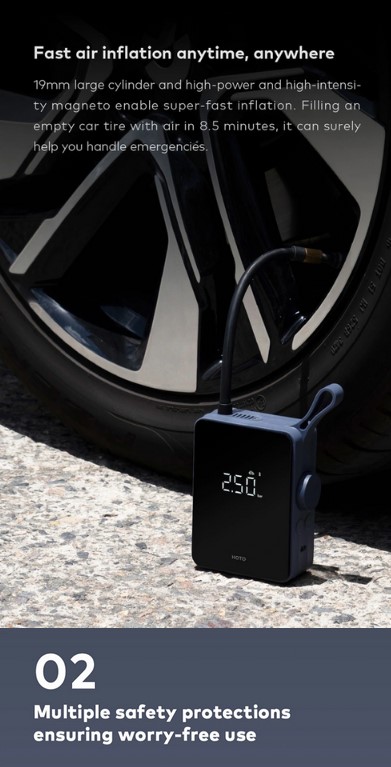 La BATTERIA INTEGRATA DA 2500MAH ricaricabile tramite connettore USB TYPE-C è più che adeguata per gonfiare la ruota sgonfia della nostra automobile in poco meno di 9 MINUTI ad una pressione massima di 150 PSI, non male per una piccoletta come questa. Particolare attenzione anche alla SICUREZZA, XIAOMI HOTO infatti cesserà automaticamente di “pompare aria” quando avvertirà troppa resistenza, evitando così spiacevoli incidenti, non manca nemmeno un FLASH LED molto comodo per illuminare l’oggetto da gonfiare al buio.