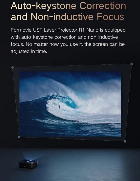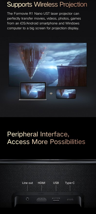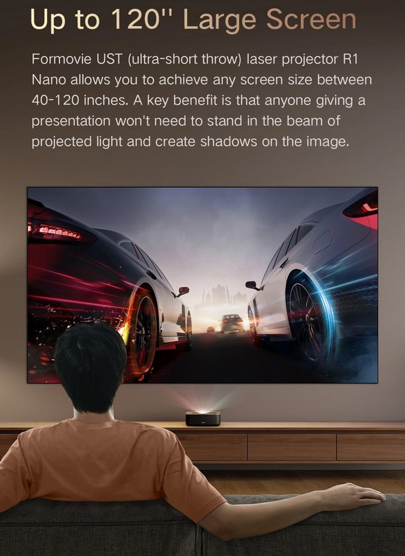 Il FENGMI R1 NANO è un PROIETTORE LASER con tecnologia ALPD di nuova generazione, questa particolare tipologia di apparecchio viene definita A TIRO ULTRA-CORTO (UST) in quanto possono riprodurre un’immagine grande fino ai 120 POLLICI a soli 60 CENTIMETRI di distanza dalla parete / telo, una grande comodità che vi farà risparmiare tantissimo spazio.