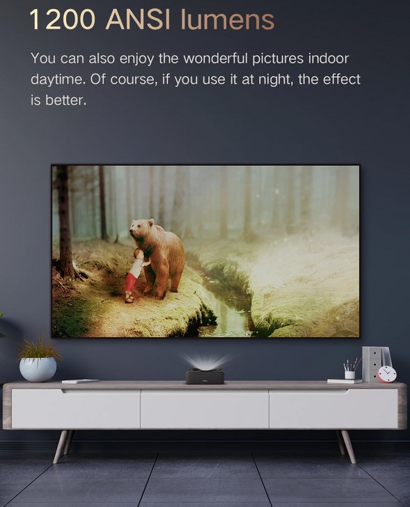 Con i suoi 1200 ANSI LUMENS l’immagine sarà sempre nitida e definita anche con molta luce nella stanza, anche se il suo meglio, come qualsiasi proiettore, lo darà in assenza di altre luci. La RISOLUZIONE MASSIMA è il FULL HD (1080P) con HDR10 e SUPPORTO AL 4K.