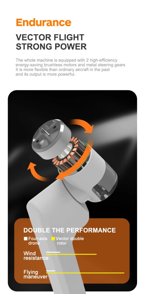 Il suo principale punto di forza risiede sicuramente nella COPPIA DI MOTORI BRUSHLESS che, auto bilanciandosi grazie a dei giroscopi interni, riescono a mantenere il drone in volo stabilizzato, garantendo fino a 30 MINUTI DI AUTONOMIA e RESISTENZA AL VENTO DI LIVELLO 5, esattamente la stessa di modelli più blasonati come il DJI MINI 2.