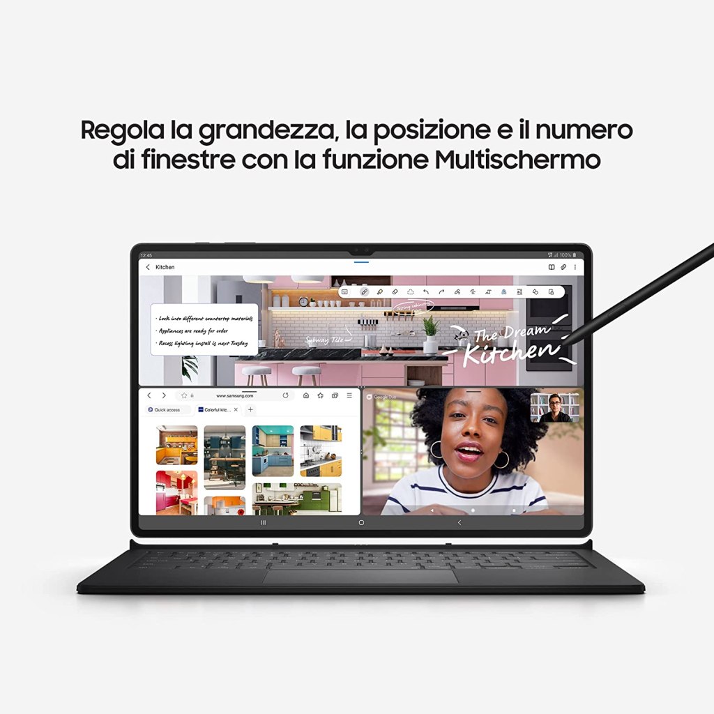 Il modello più grande mai prodotto e unico nel suo genere, basti citare l’incredibile DISPLAY sAMOLED 120HZ DA 14.6 POLLICI WQXGA+ della versione S8 ULTRA racchiuso in una cornice sottilissima e 6mm di spessore, il minimo indispensabile per riuscire ad utilizzarlo senza la paura di “tocchi involontari”. Il sistema operativo per l’intera gamma è ANDROID 12, peccato non sia presente WINDOWS (o entrambi) secondo noi avrebbe espanso enormemente le sue doti legate alla produttività, specialmente in accoppiata con tastiera e stylus.