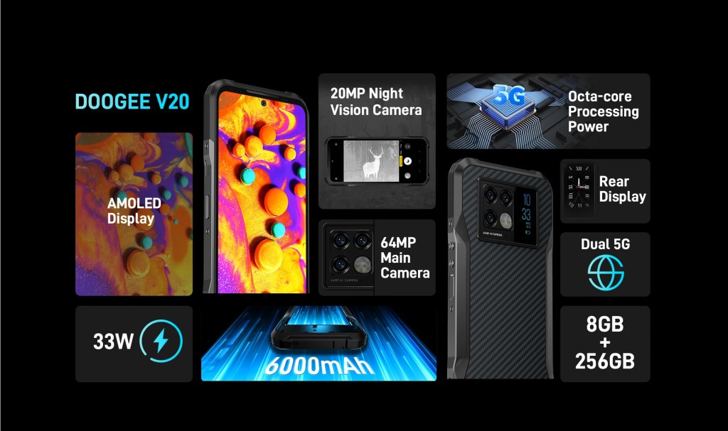 Il DOOGEE V20 è uno smartphone realizzato con finiture in FIBRA DI CARBONIO e dotato di svariate certificazioni di resistenza alle cadute, perfetto quindi per i più “distratti”, per chi fa lavori impegnativi e per gli amanti dello sport che non vogliono rischiare di rompere il telefono alla prima caduta.