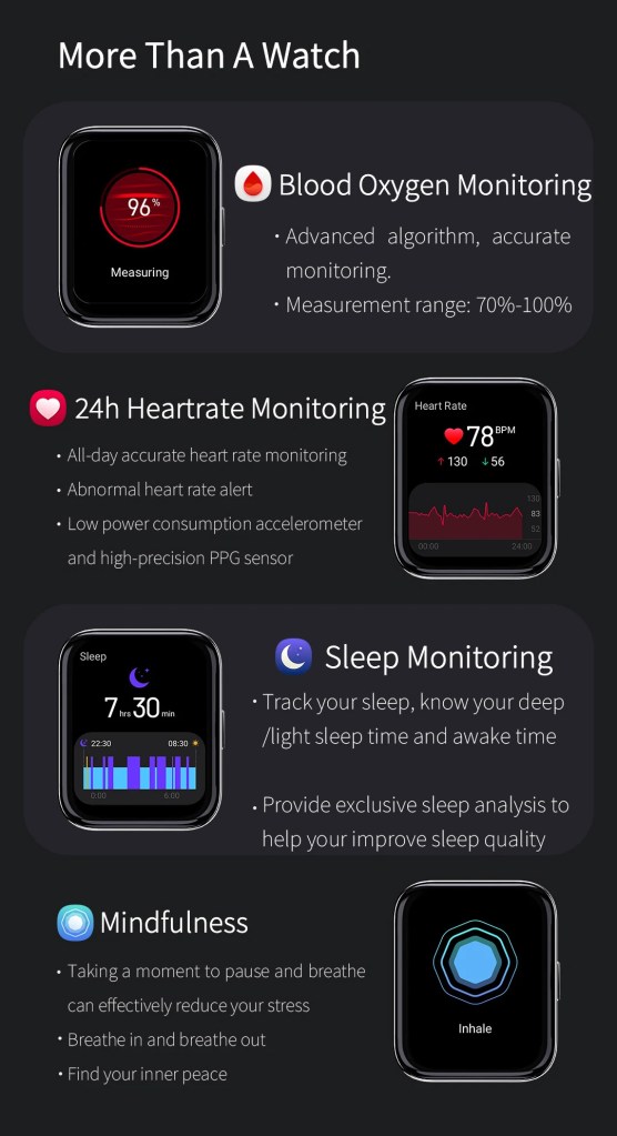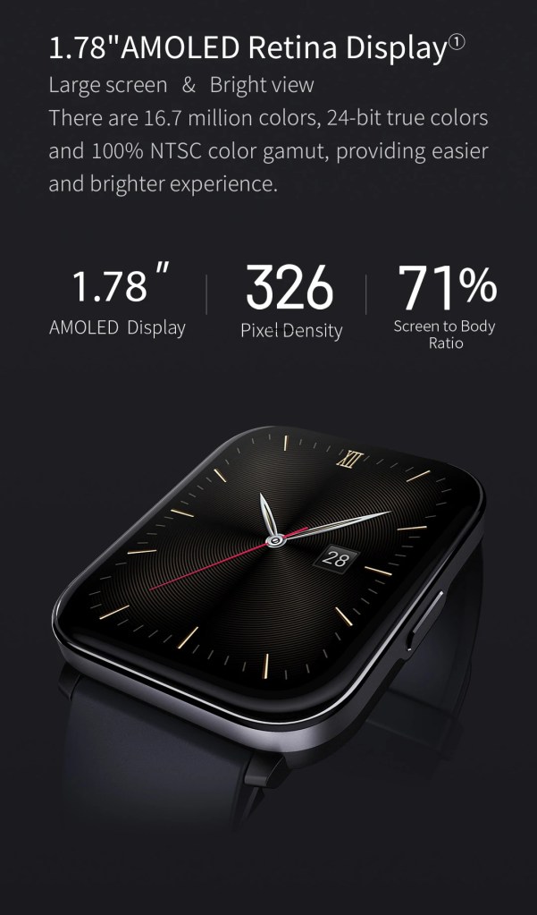 HEY PLUS WATCH si presenta con un grande DISPLAY AMOLED DA 1.78″ 368*448 PIXEL quasi totalmente BORDERLESS con tanto di ALWAYS ON DISPLAY e WATCHFACES DINAMICHE, un vero piacere per gli occhi, specialmente abbinato alla CASSA IN ALLUMINIO estremamente sottile e dal peso complessivo di circa 35 GRAMMI.