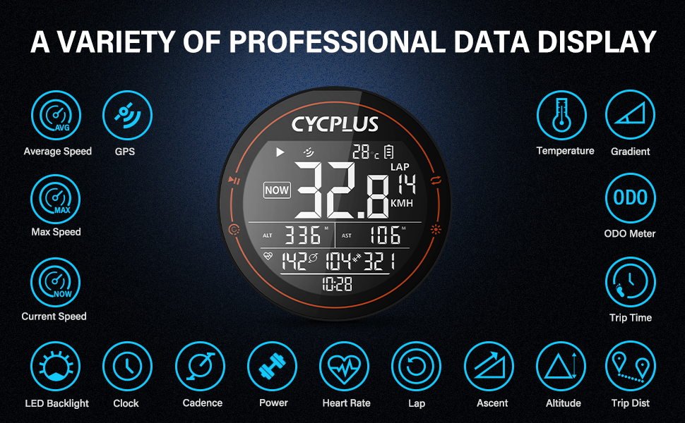 Una volta montato e SINCRONIZZATO TRAMITE APP DEDICATA (supporta anche STRAVA), il grande DISPLAY LED DA 2.5 POLLICI RETROILLUMINATO restituirà una moltitudine di dati, come la velocità, orario, cadenza, battito cardiaco (è necessario associare una smartband o smartwatch), altitudine, temperatura e distanza percorsa.