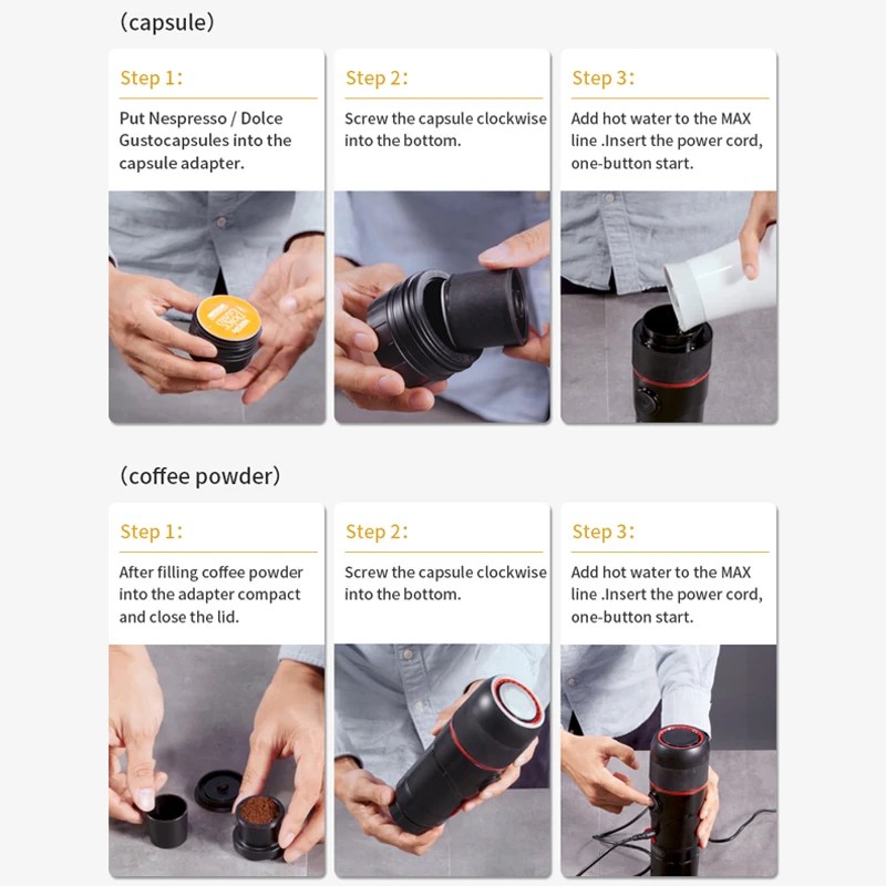Una volta scelta la tipologia di caffè che preferiamo ci basterà alimentarlo collegando ALLA PRESA ACCENDISIGARI DELLA NOSTRA AUTOMOBILE o qualsiasi altra presa di corrente (persino USB) a portata, magari di una power station in campeggio, in pochi secondi sarà pronto ad erogare il prezioso nettare caldo grazie alla sua POMPA DA 15 BAR e il risultato è ben più che soddisfacente, quasi come al bar! Smontare e pulire la macchina in ogni sua parte è estremamente semplice e immediato.