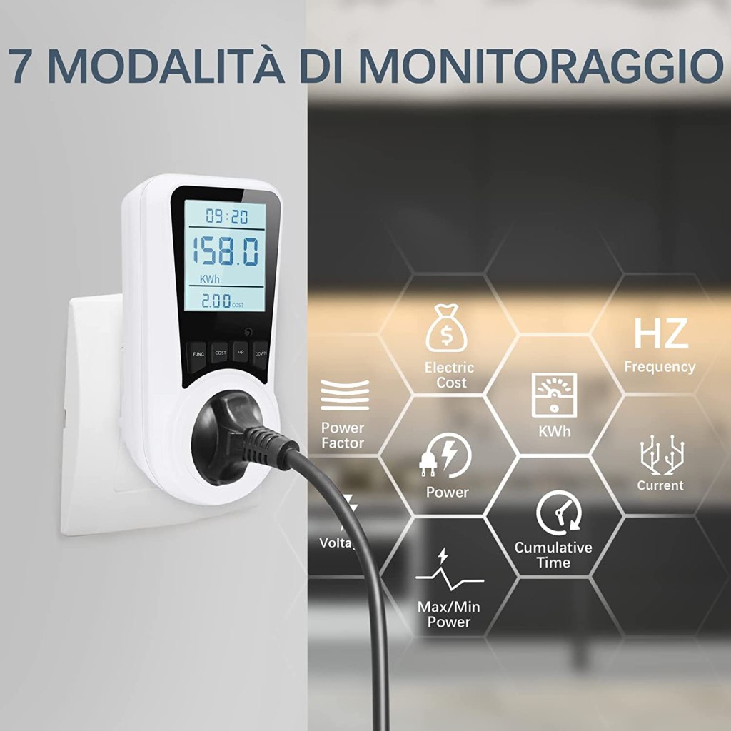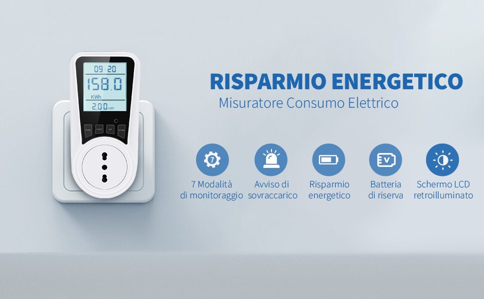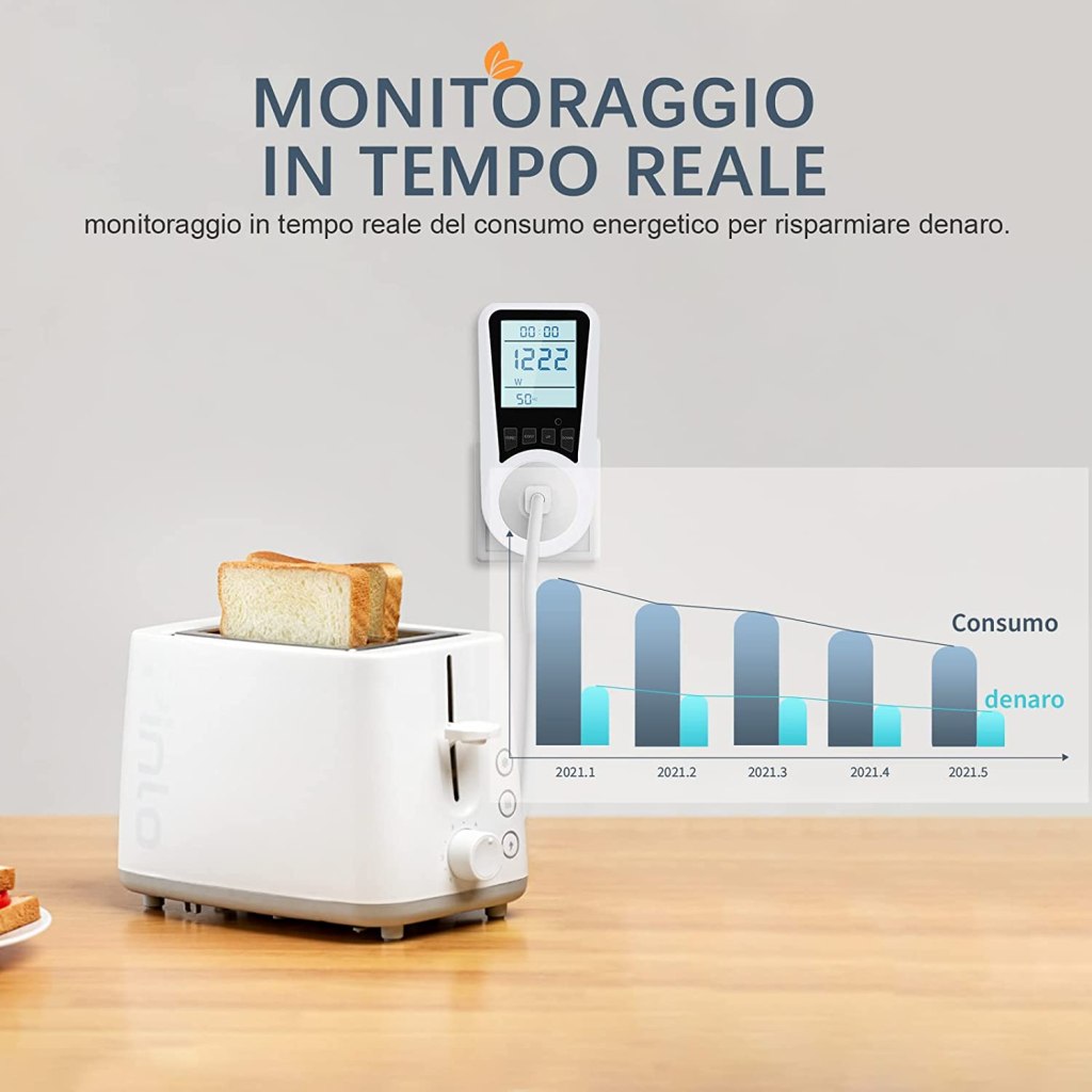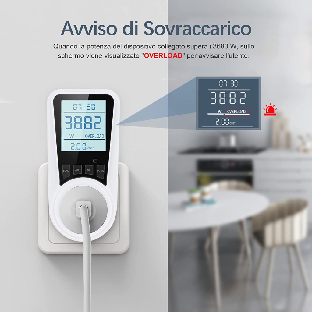 Estremamente FACILE da utilizzare, basterà impostare i valori desiderati tramite i tasti fisici posti sotto al DISPLAY LCD RETROILLUMINATO. È persino in grado di RILEVARE UN SOVRACCARICO superiore ai 3680W, segnalandocelo tempestivamente. Ideale quindi per diversi dispositivi, dal computer al condizionatore d’aria passando per frigorifero, lavastoviglie, microonde e altro ancora, non serviranno adattatori in quanto la presa è italiana.