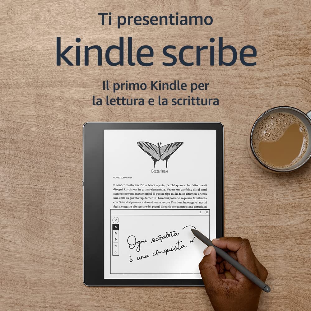 Con KINDLE SCRIBE potremo accedere allo sconfinato KINDLE STORE DI AMAZON con MILIONI DI LIBRI DIGITALI a prezzi super scontati. SCRIVERE O DISEGNARE APPUNTI e pensieri tra una pagina e l’altra è ora possibile utilizzando la PENNA CON ATTACCO MAGNETICO IN DOTAZIONE, disponibile nella sua variante BASIC o PREMIUM con gomma all’estremità e un tasto di scelta rapida.