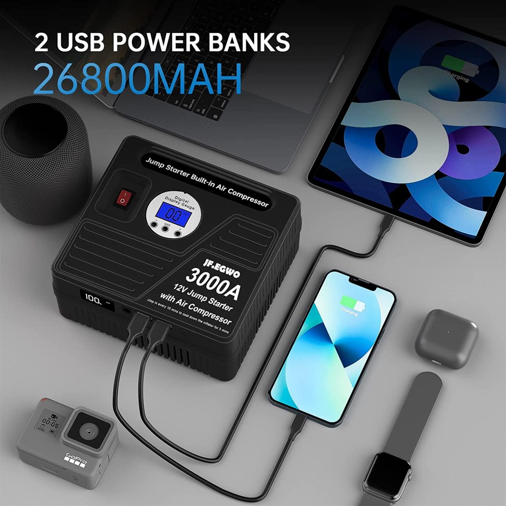 Ma ovviamente non finisce qui, al suo interno trovano posto un utilissimo COMPRESSORE D’ARIA DA 150 PSI per gonfiare le gomme della nostra vettura, della bici o in casi particolari persino un pallone o materassino; una TORCIA ELETTRICA LED DA 400 LUMEN con funzione S.O.S. e intensità variabile ed infine una POWER BANK DA 26.800MAH con 2 PORTE USB IN USCITA per la ricarica di smartphone, laptop o altri dispositivi elettronici.