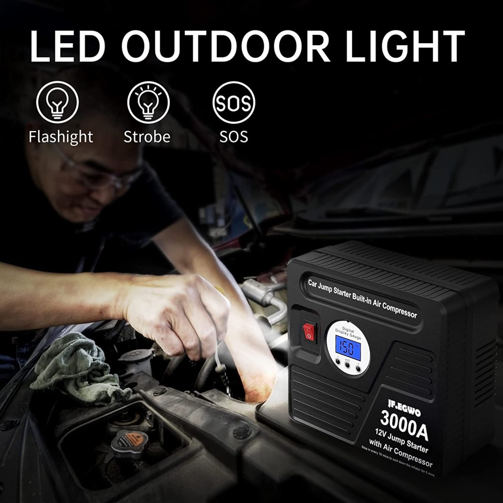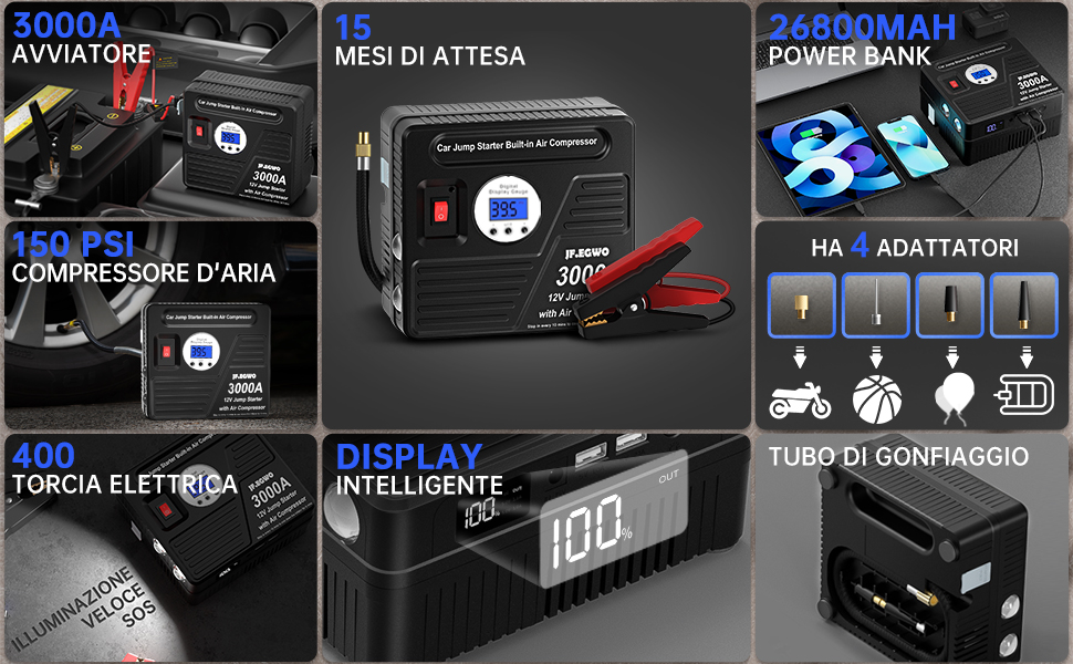 JF.EWGO è un dispositivo che non dovrebbe mancare nella DOTAZIONE DI SICUREZZA della nostra AUTOMOBILE. È principalmente un AVVIATORE / JUMPER (se non sapete di cosa si tratta guardate questo nostro video dedicato all’argomento) da 3000 AMPERE in grado di avviare qualsiasi tipo di mezzo con BATTERIA SCARICA, dallo scooter al camion passando per moto, barche e ovviamente auto.